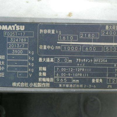 Xe nâng dầu Komatsu 2.5 tấn, model: FD25T-17. Dòng xe nâng dầu ngồi lái cuối cùng trước khi hãng dừng sản xuất từ 2015 tại Nhật, tiết kiệm nhiên liệu, dùng bơm kép giúp thủy lực khỏe hơn 1.2 lần so với xe dầu (diesel) tương tự, được hãng Komatsu nhật sản xuất cho độc quyền cho dòng xe dầu Komatsu.