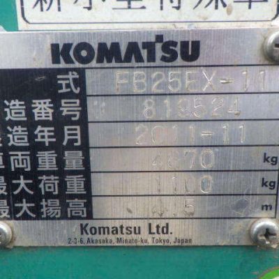 Xe nâng điện Komatsu FB25EX-11 sản xuất năm 2011 là dòng xe nâng 4 bánh chạy điện, có tải trọng 2.5 tấn và được trang bị mâm xoay, giúp nâng cao hiệu suất làm việc trong kho hàng hoặc nhà máy có không gian hẹp. Komatsu là thương hiệu xe nâng nổi tiếng của Nhật Bản, được đánh giá cao về độ bền và khả năng vận hành ổn định.